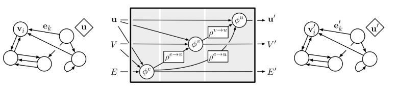 简单的说,图网络(graph network)是将graph作为输入,并返回graph作为输出的神经网络。输入图具有edge-(E ), node-(V ), 和global-level(u) 的属性。输出图具有相同的结构,但更新了属性。Graph networks是更广泛的“graph neural networks”家族的一部分(Scarselli et al., 2009)。