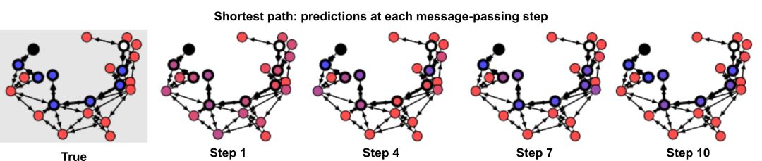 “最短路径演示”创建随机的graph,并训练图网络以标记任意两个节点之间的最短路径上的节点和边缘。在一系列消息传递步骤中,模型改进了对最短路径的预测。