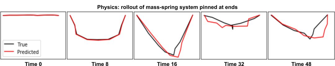 "physics demo"创建随机质量的弹簧物理系统,并训练一个图网络来预测系统在下一时间步长的状态。模型的下一步预测可作为输入反馈进来,以创建未来轨迹的rollout。下面的每个子图显示了50步以上的真实和预测mass-spring系统状态。这类似于Battaglia et al. (2016)提出的"interaction networks”里的模型和实验。