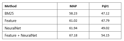 由于目前表格检索的公开数据集有限,因此我们构建了一个包含21,113个自然语言问题和273,816个表格的数据集。在该数据集上,我们对比了基于BM25的系统、基于手工定义特征的系统以及基于神经网络的系统,结果如下表所示。