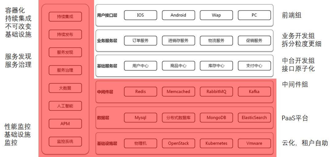 多种多样的中间件,每个团队独立选型中间件,没有统一的维护,没有统一的知识积累,无法统一保障SLA。一旦使用的消息队列,缓存,框架出了问题,整个团队没有人能够搞定这个事情,因为大家都忙于业务开发,没人有时间深入的去研究这些中间件的背后原理,常见的问题,如何调优等等。