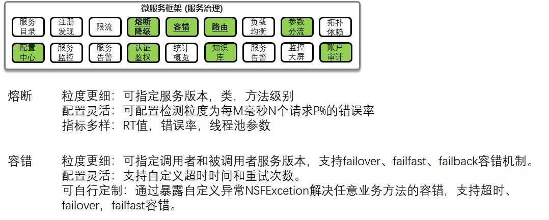 在服务之间,也可以通过微服务框架,进行熔断,限流,降级。Dubbo对于服务的控制在接口层面,SpringCloud对于服务的管理在实例层面,这两个粒度不同的客户选择不一样,都用Dubbo粒度太细,都用SpringCloud粒度太粗,所以需要可以灵活配置。