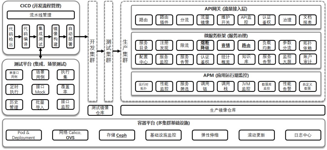 因而基于Kubernetes和SpringCloud,就有了下面这个微服务,容器,DevOps的综合管理平台。包含基于Kubernetes的容器平台,持续集成平台,测试平台,API网关,微服务框架,APM应用性能管理。