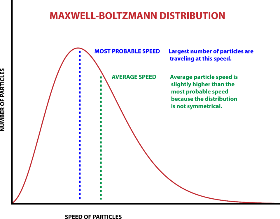 通常,大多数物体的动能包含在平移动能里,也就是物体在空间平行移动具有的能量。气体中的原子和分子沿着各个方向飞速移动,彼此碰撞,也与容器壁碰撞反弹。单个原子和分子的移动速度不同,但是对于某个确定温度下的大量原子和分子,它们的速度可以通过统计和概率的方法来描述,结果表明,粒子的速度(能量)和数量分布遵循所谓的麦克斯韦-玻尔兹曼分布。这意味着,大多数粒子分布在一段特定的速度区间里。