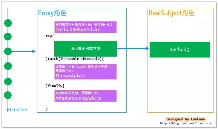 为了降低我们对Spring的AOP的理解难度,我在这里将代理角色的职能进行了简化,方便大家理解。(注意:真实的Spring AOP的proxy角色扮演的只能比这复杂的多,这里只是简化,方便大家理解,请不要先入为主)代理模式的代理角色最起码要考虑三个阶段: