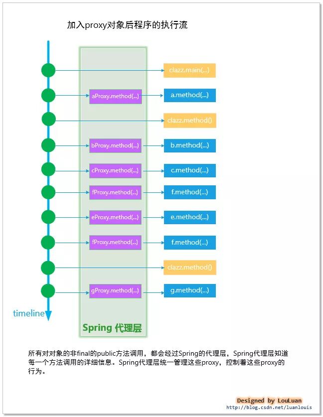 既然Spring代理层可以察觉到你所做的每一次对实例对象的方法调用,那么,Spring就有机会在这个代理的过程中插入Spring的自己的业务代码。