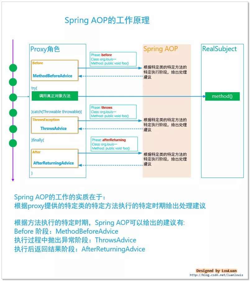 现在我们假设当前RealSubject这个角色的类是org.luanlouis.springlearning.aop.FooService,当前这个连接点对应的方法签名是:public void foo()。那么上述的代理对象的三个阶段将会有以下的处理逻辑: