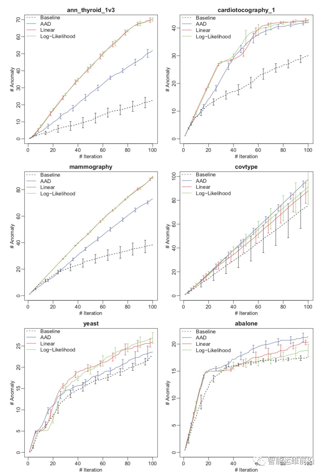在公开数据集上的实验结果如图4所示,横坐标是反馈迭代的次数k,纵坐标是top-k中发现的异常个数,显然,Feedback-guided Anomaly Detection(log-likelihood, linear)能够发现更多的异常。