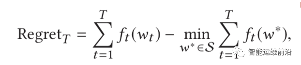 根据运维人员的反馈来调整异常检测器的参数可以转换成在线凸优化(onlineconvex optimization)的问题。首先给定异常检测器(论文中假设异常检测器都是广义线性模型)的一组参数wt ,和一个凸损失函数ft, 计算在wt下损失ft(wt),优化的目标是让Regrett接近0,其中w*是检测器的最优参数配置。