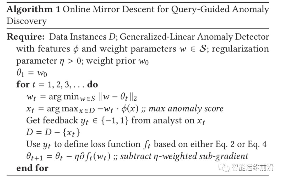 为了节约排查时间,在这篇论文中,运维人员会把自己的领域知识融入到异常检测中,针对初始的异常分数排名,给出排名靠前的样本的反馈之后,模型会根据这个反馈来重新调整参数,从而输出新的异常分数排名,目的是使运维人员感兴趣的异常排在靠前的位置,从而节约排查异常所需的时间。此外,文章把反馈引导的异常检测问题转换成了在线凸优化的算法框架,并且对运维人员的反馈定义一个凸损失函数,推导出了简单、高效、有效的优化算法。 通过把这套框架应用到孤立森林(Isolation Forest),在公开数据集的实验和一个大规模空间安全安全应用的实例证明了框架的有效性。