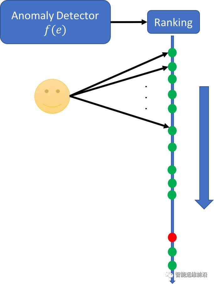 在这篇文章中,基于主动学习(active learning)的思想,作者提出了一种运维人员参与的交互异常检测框架。根据运维人员对异常检测结果提供的反馈,异常检测模型迭代更新,从而减少误报率。在传统的异常检测中,算法会输出异常分数的排名供运维人员参考,运维人员会按照异常分数从高到低的顺序一一核查,如果运维人员感兴趣的业务异常被排在后面(如图1所示,红色的点为异常),那么就会花费很高的时间成本来找到它们。
