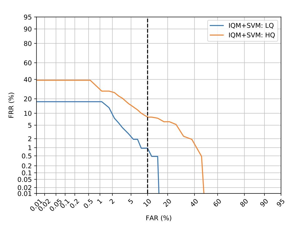 基于图像质量测度(IQM)的系统借鉴了表示域(domain of presentation )的攻击检测,表现出了较好的性能。作为IQM特征向量,使用129个图像质量度量,其中包括信噪比,镜面反射率,模糊度等测量。