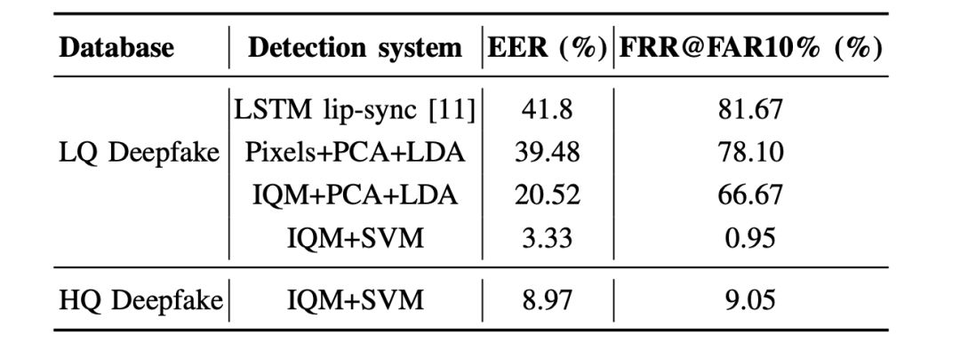 其次,IQM+SVM系统对Deepfake视频的检测准确率较高,但使用HQ模型生成的视频具有更大的挑战性,这意味着越先进的人脸交换技术将愈发难以检测。