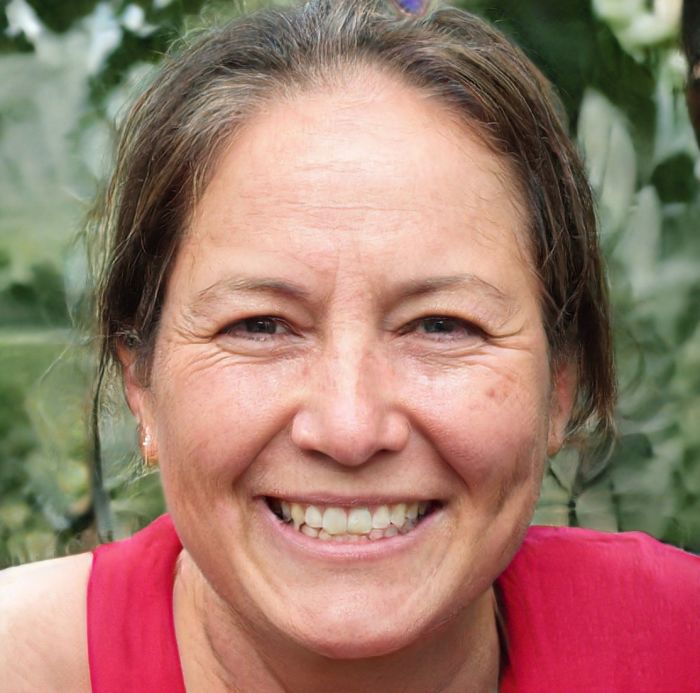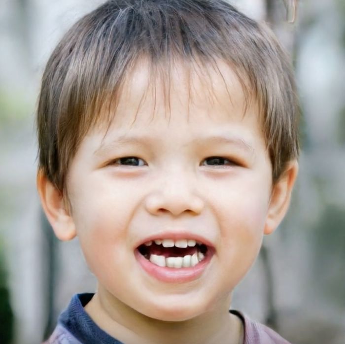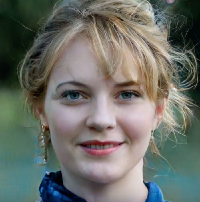 上面这张图可能稍微难辨别一点,但如果你仔细看她的牙,会发现她中间第三颗牙异常地小,而且耳朵也非常不自然,所以这也是一张生成的假头像。