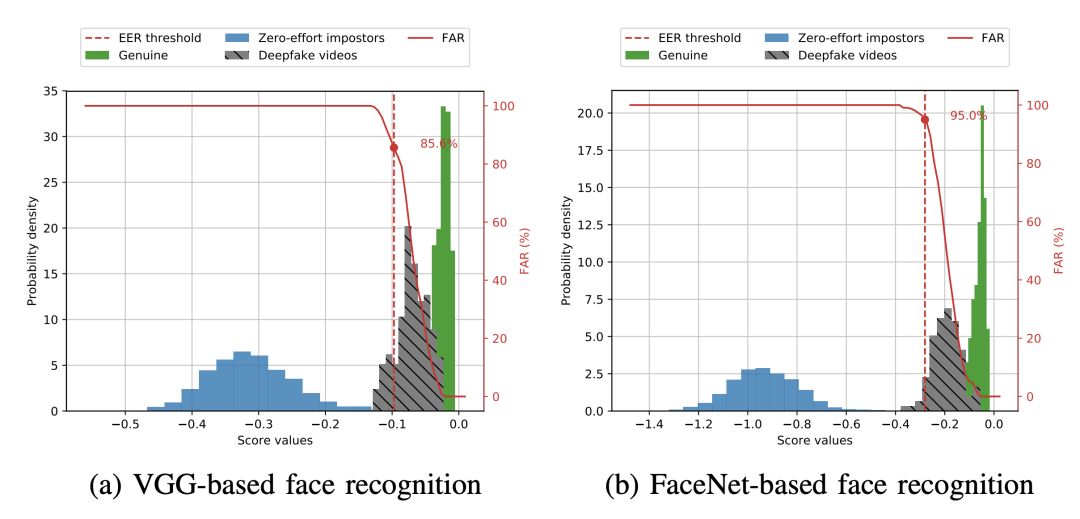 直方图显示了基于VGG和Facenet的人脸识别在高质量人脸交换中的漏洞。