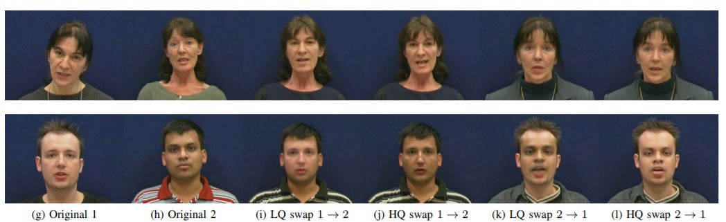 他们从公开的VidTIMIT数据库中,手动选择了16对长相类似的人,将这32个目标都训练两种不同的模型,分别为低质量(LQ) 模型,输入/输出大小为64×64,以及高质量(HQ) 模型,输入/输出大小为128×128尺寸的模型(参见图1)。