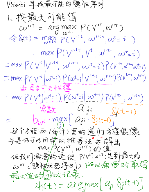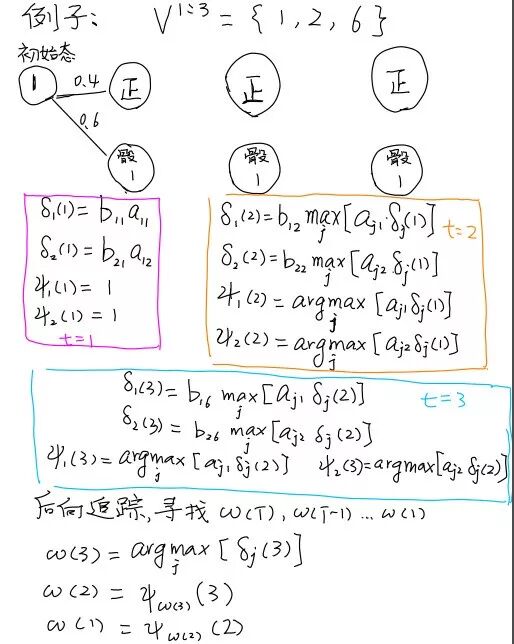在完成前向推导法之后,再使用后向追踪法(Back Tracking),对求解出能令这个P(w(1:T), V(1:T))最大的隐性序列。这个算法被称为维特比算法(Viterbi Algorithm).