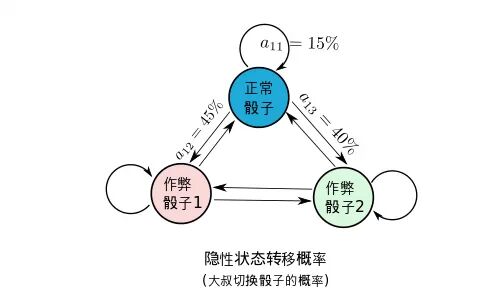 系统的隐性状态指的就是一些外界不便观察(或观察不到)的状态, 比如在当前的例子里面, 系统的状态指的是大叔使用骰子的状态,即