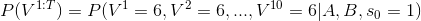 现在我们有了大叔的状态转移概率矩阵A,B就能够进行估计。比如我们想知道这位大叔下一局连续掷出10个6的概率是多少? 如下