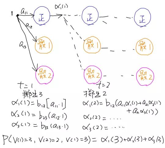 有了这个方程,我们就能从t=0的情况往前推导,一直推导出P(V1:T)的概率。下面让我们算一算,大叔掷出3,2,1这个骰子序列的可能性有多大(假设初始状态为1, 也就是大叔前一次拿着的是正常的骰子)?