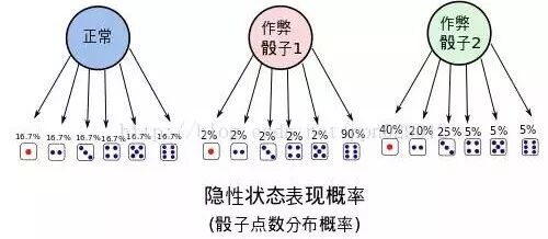 当然同时也会有,隐性状态表现转移概率。也就是骰子出现各点的概率分布, (e.g. 作弊骰子1能有90%的机会掷到六,作弊骰子2有85%的机会掷到'小’)。给个图如下: