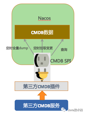 先不考虑如何将CMDB的数据应用于负载均衡,我们需要首先在Nacos里将CMDB的数据通过某种方法获取。在实际使用中,基本上每个公司都会通过购买或者自研搭建自己的CMDB,那么为了能够解耦各个企业的CMDB具体实现,一个比较好的策略是使用SPI机制,约定CMDB的抽象调用接口,由各个企业添加自己的CMDB插件,无需任何代码上的重新构建,即可在运行状态下对接上企业的CMDB。