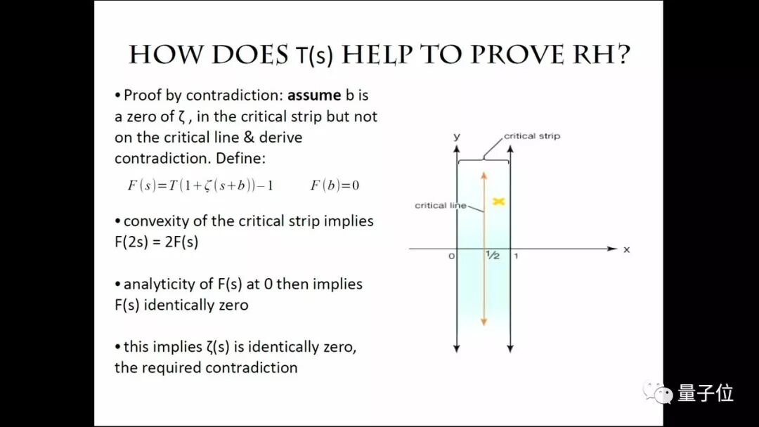 在他40分钟的演讲中,阿蒂亚大部分在回顾历史,严格来讲,只有三分多钟在讲解他如何使用了一个简单的反证法,就证明了159年来无人能攻克的黎曼猜想。